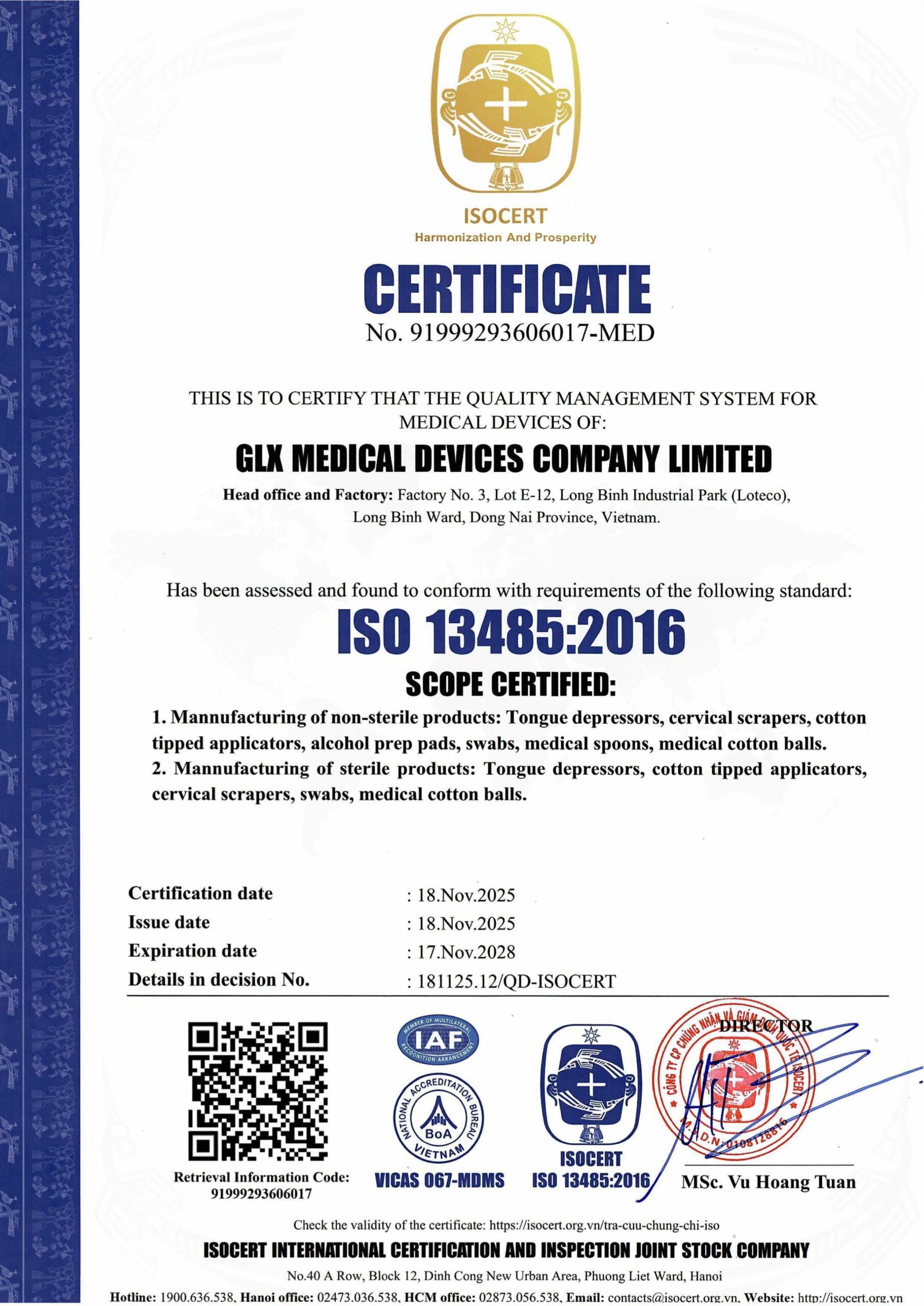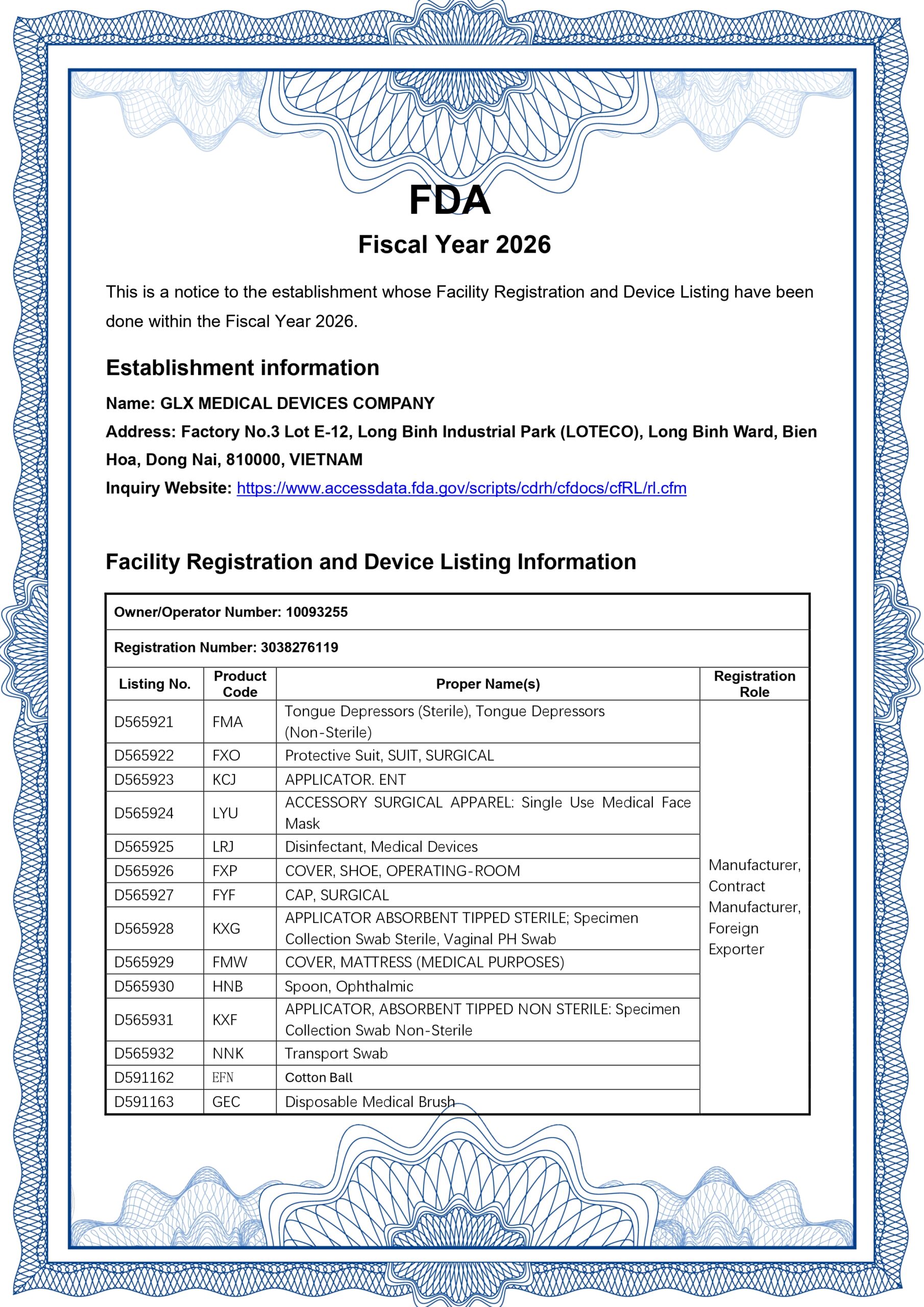 GLX MEDICAL DEVICES COMPANY LIMITED specializes in the production and supply of disposable medical materials for hospitals, clinics, and healthcare facilities nationwide, while actively expanding its export operations to international markets. With a team of experienced professionals, advanced production lines, and strict quality control processes, GLX is committed to delivering high-standard, safe, and effective products. The company’s main products include medical cotton swabs, tongue depressors, and alcohol prep pads—essential items in clinical examination and healthcare. GLX continuously innovates, scales up its manufacturing capacity, and broadens its market reach, aiming for sustainable development and becoming a trusted partner in the regional and global medical supply industry.